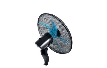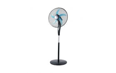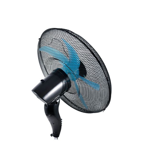 Ventilatore a piantana Ø 50 cm, pala colorata in semitrasparenza turchese, griglia a nido d’ape, oscillazione laterale automatica. Inclinazione verticale. Potenza 70W, 3 velocità, base tonda, look total black. Altezza regolabile 120-167 cm.