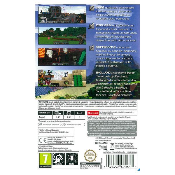 La versione fisica di Minecraft per Nintendo Switch contenente l’aggiornamento Bedrock, che permette di giocare assieme agli utenti Xbox One, PC, Android, iOS e PS VR, oltre a contenere una serie di aggiornamenti che rendono il gioco ancora più completo, ricco e vario.